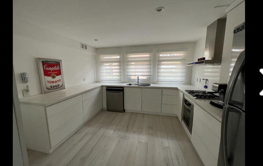 -Cocina con muebles bajo y sobre mesada, bacha de acero inoxidable, purificador de aire, mesada de Silestone