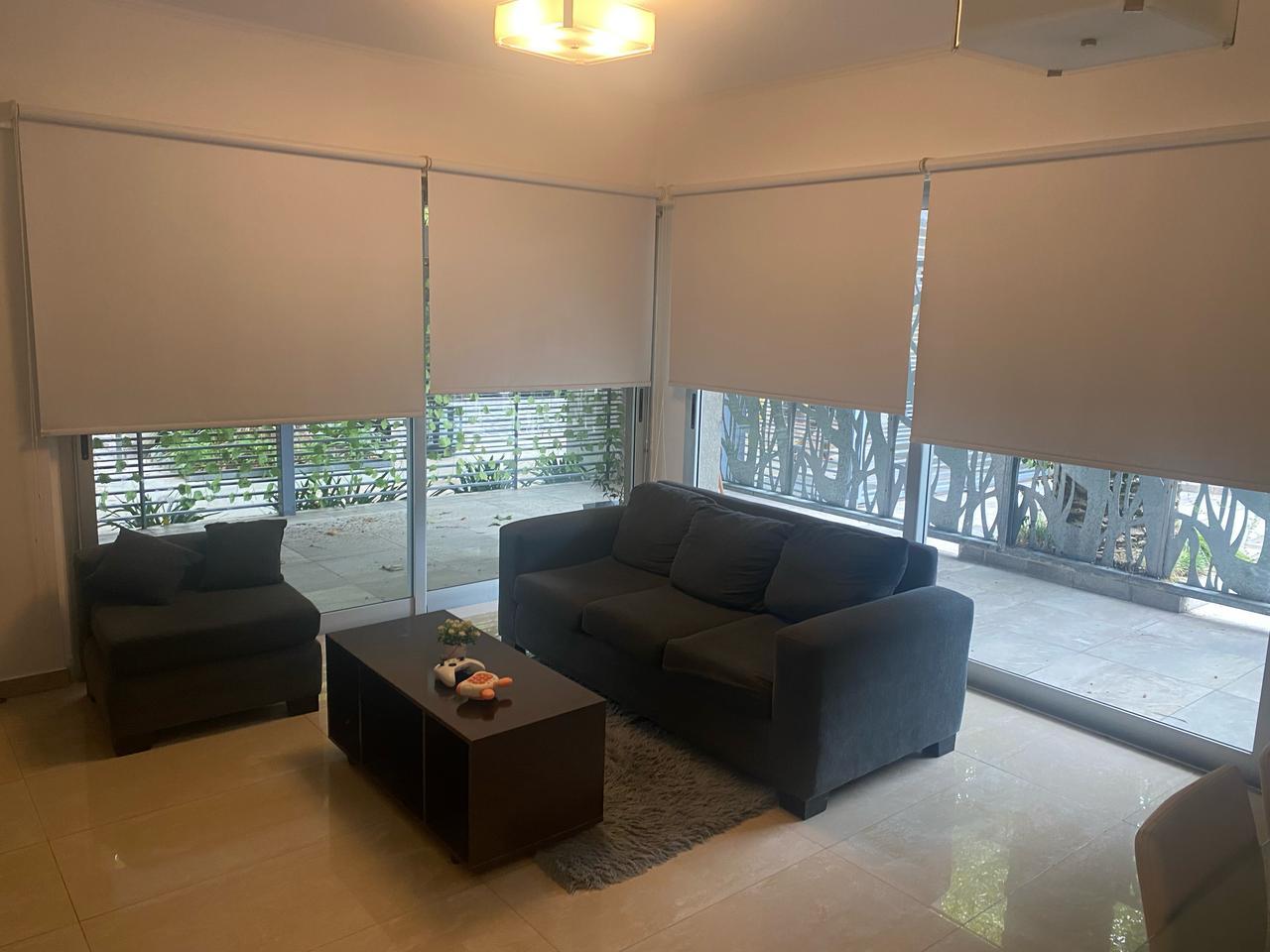 LIVING-COMEDOR: 2 plafones colgantes de vidrio, 4 apliques con tulipas de vidrio, 1 aire acondicionado frio-calor marca Electra de 3000 frigorías, 4 puertas corredizas con 4 cortinas Roller blackout color blancas.