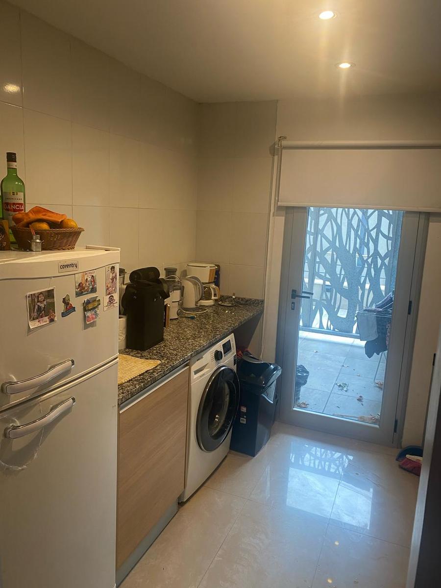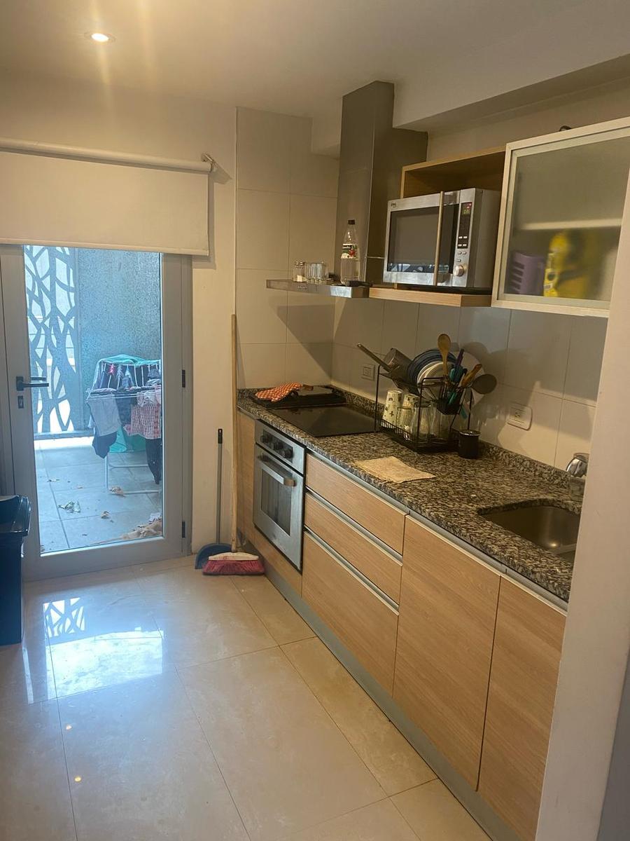 COCINA: Mesada de mármol con vaca de acero inoxidable, canilla mono comando y bajo mesada de madera de 3 puertas y 3 cajones, 1 alacena de 1 puerta grande de vidrio esmerilado, 1 extractor de aire de acero inoxidable marca TST con luces, 1 artefacto de cocina eléctrica de 4 hornallas y horno marca TSL, 1 puerta salida con cortina roller blackout blanca.