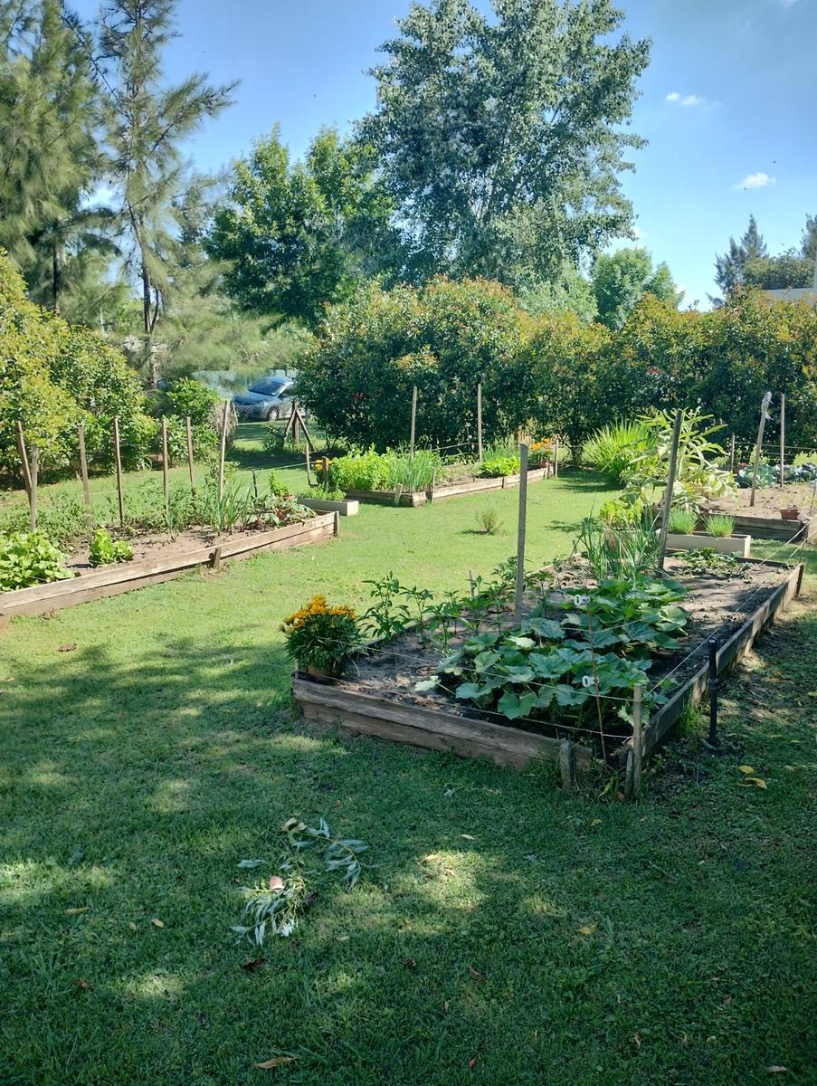 Gran fondo, con diversidad de árboles y plantas. Cerco perimetral, alambrado y vivo.