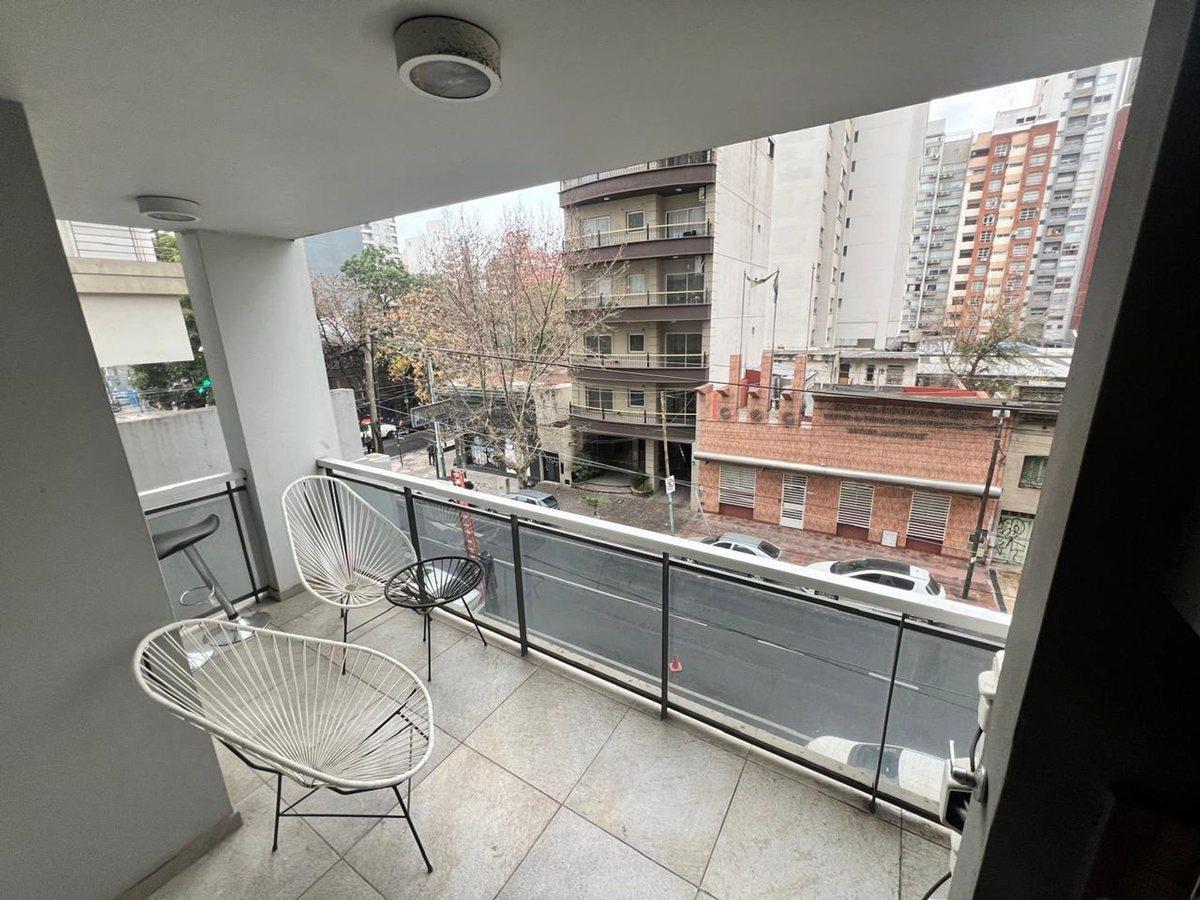 El ingreso a un luminoso living-comedor con pisos de porcelanato , aire acondicionado , y salida a un amplio balcón con vista al frente y parrilla individual a gas.